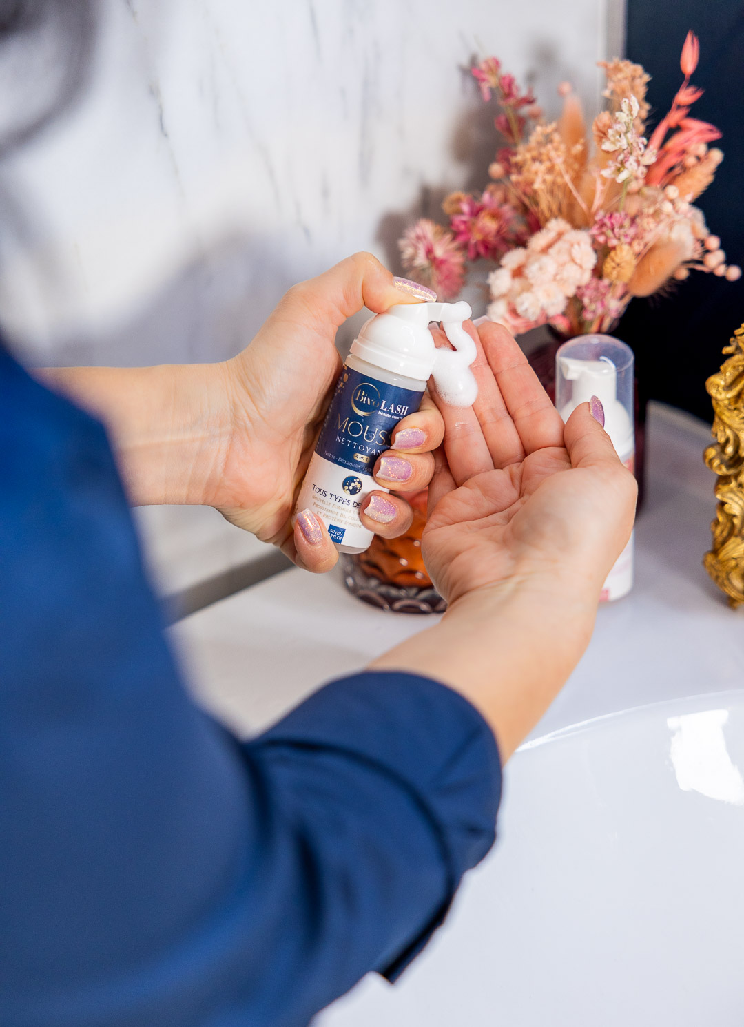 Appliquer la mousse nettoyante Bivolash sur les cils et le contour des yeux puis masser délicatement avant de rincer à l’eau.